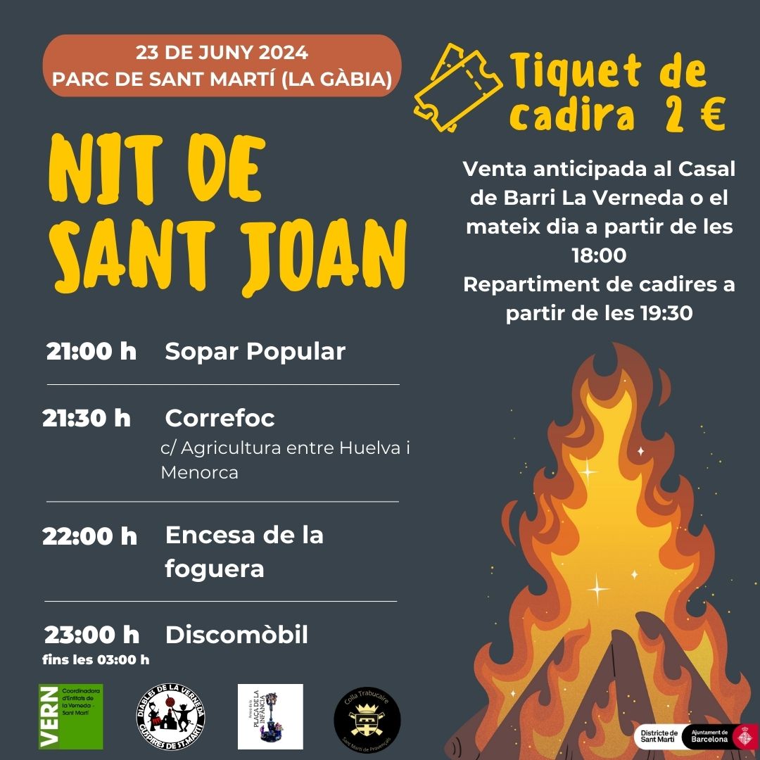 Estiu, caloret, fogueres i ballaruca… Ja ho sabeu, oi? Ja tenim aquí la Revetlla de Sant Joan d’enguany! Aquest diumenge 23 de juny a partir de les 21:00, comença tota la festa. Com cada any, la flama del canigó arribarà a la Gàbia, farem un sopar per tothom, s’encendrà la foguera de Sant Joan, hi haurà correfoc pels carrers del barri i un bon DJ per amenitzar tota la vetllada!