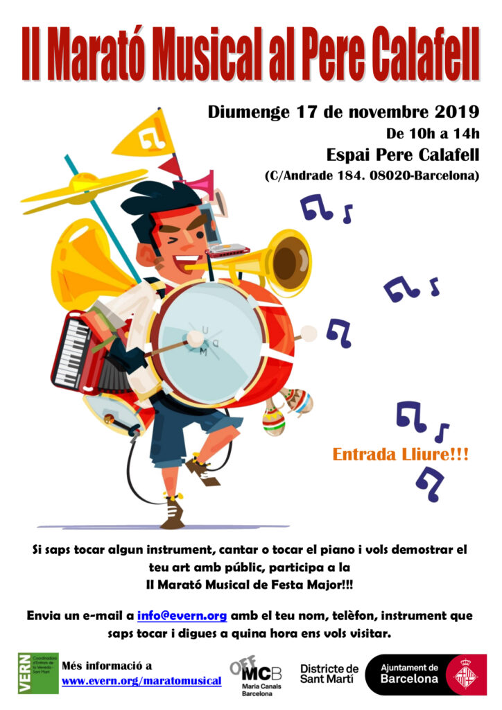 L’any 2018 les entitats del barri vam realitzar una acció per tal de reivindicar l’Escola de Música Municipal. Gràcies a la organització de la Coordinadora d’Entitats VERN i de la participació de nombroses entitats i veïnat es va organitzar la 1a Marató Musical a la Pere Calafell.